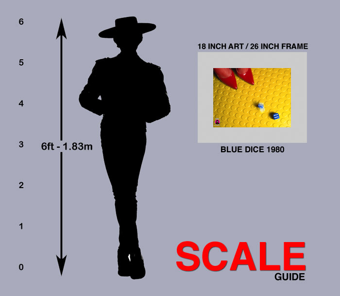One of the most remarkable things about this piece is the colour palette, which is very unusual for the artist. It was in fact created just before Elliott shifted towards his trademark reds, purples and blues in the early Eighties.The picture has a wonderful sense of dynamism, with the usual subtle touches such as the flooring visually echoing the dice dots. Needles to say you can’t buy flooring in that colour so Elliott aerosprayed it to the exact shade. Elliott also made the blue dice when, after endless searching, Elliott concluded large blue dice do not exist.