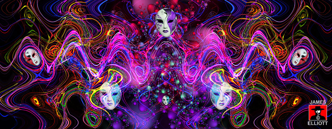 Widely hailed as one of Elliott's greatest masterpieces, 'The Magical Masquerade' spanned a huge 30 year arc in it's creation, Starting in Paris in 1986. Interestingly the year Elliott commenced computer art. The picture uses a myriad of technologies, including elements created in 2005 and 2007. The image is infused with an astonishing vibrancy and vivacity. A hugely celebratory image with dazzling use of colour. It would be impossible to think of a finer piece of art to grace the walls of the glitterati. Too electric for a museum. Too alive.